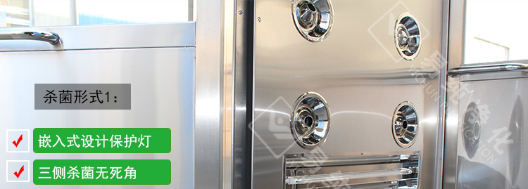 1、內部安裝嵌入式紫外線殺菌燈,通過紫外波長為254微米的光波對室內的微生物細菌進行殺菌,從而抑制細菌的增長和繁衍。由于紫外線對人體有一定的傷害,故人員在室內的時候不適合殺菌,一般我們是采用定時裝置,在無人員的情況下進行殺菌。在控制系統里面安裝定時計時裝置,自動啟動殺菌系統。