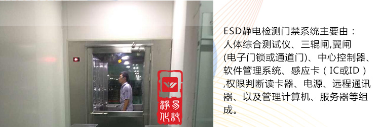 ESD靜電檢測門禁系統主要由:人體綜合測試儀、三輥閘,翼閘(電子門鎖或通道門)、中心控制器、軟件管理系統、感應卡(IC或ID),權限判斷讀卡器、電源、遠程通訊器、以及管理計算機、