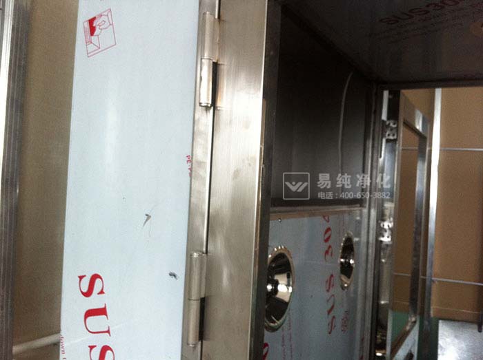 (四)整體框架完成之后,再進行門安裝,門和門框皆由不銹鋼方管及不銹鋼制作,鉸鏈采用三道不銹鋼鉸鏈加固,原門框與門板已經由廠家出廠前已經安裝好。此時只需要將鉸鏈固定于風淋側面廂體之可。如果門安裝好之后門框與箱體之間縫隙不齊平有摩擦,那么是因為地平不平而導致,此步驟并不需要調整門框,只需要對風淋下部進行垂直校正,將風淋底盤墊平即可??煞磸驼{試四角加墊片,一旦墊平,門體將會與箱體縫隙完全整齊。