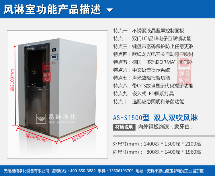 名稱:風淋室(又名空氣浴塵室、風淋房、風淋門、空氣吹淋室、AIR SHOWER,風淋設備,風淋機之類)是人員進出無塵室所必需的通道,并同時起到氣閘室密閉無塵室的緩沖作用,是進行人員除塵和防止室外空氣污染無塵室的有效設備,也是目前凈化車間人員通的必需設備。